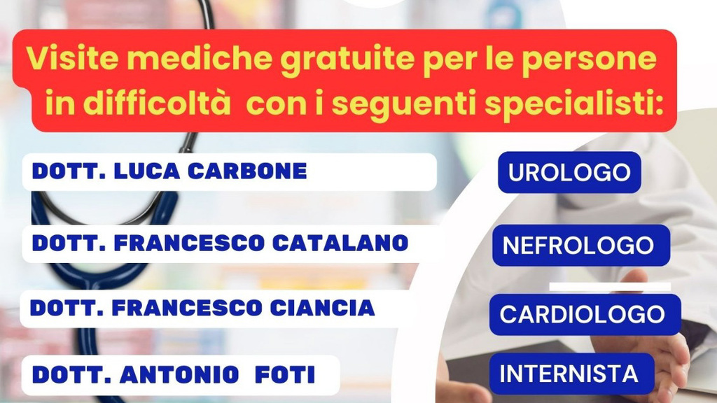 Saranno presenti i seguenti medici specialisti, che offriranno la loro professionalità in forma totalmente gratuita: Dott. Luca Carbone – Urologo, Dott. Francesco Catalano – Nefrologo, Dott. Francesco Ciancia – Cardiologo, Dott. Antonio Foti – Internista.