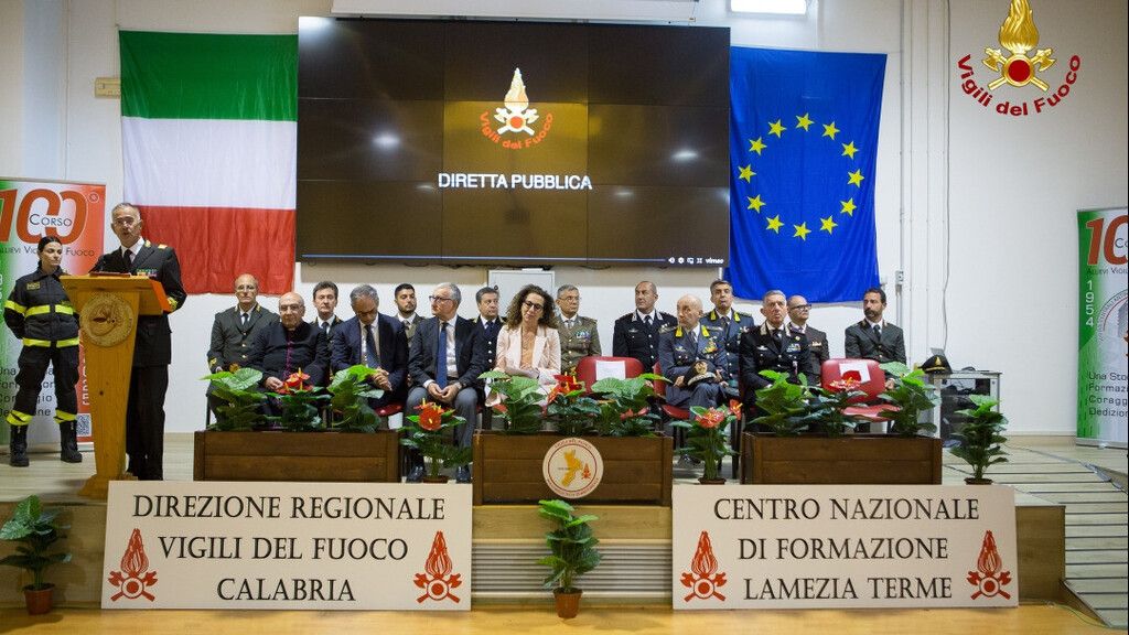 Infatti, la concomitanza delle elezioni amministrative regionali in Calabria con le giornate di preparazione alla cerimonia pianificate presso le Scuole Centrali Antincendi in Roma, ha determinato la decisione dell’Amministrazione Centrale dei Vigili del Fuoco di consentire alle unita VV.F. del 100° corso residenti in Calabria (56 unità) - che ne avessero fatto richiesta - di pronunciare la formula di giuramento, presso il Centro Polifunzionale Regionale VV.F. di Lamezia Terme, in video collegamento con le Scuole Centrali Antincendi di Roma-Capannelle, dove ha avuto luogo in contemporaneità con il giuramento degli altri Vigili del Fuoco del 100° corso, alla presenza del sig. Ministro dell’Interno Matteo Piantedosi, del capo Dipartimento dei Vigili del Fuoco, del Soccorso Pubblico e della Difesa Civile Attilio Visconti e del Capo del Corpo nazionale dei Vigili del Fuoco Eros Mannino e di altre importanti Autorità civili, religiose e militari.