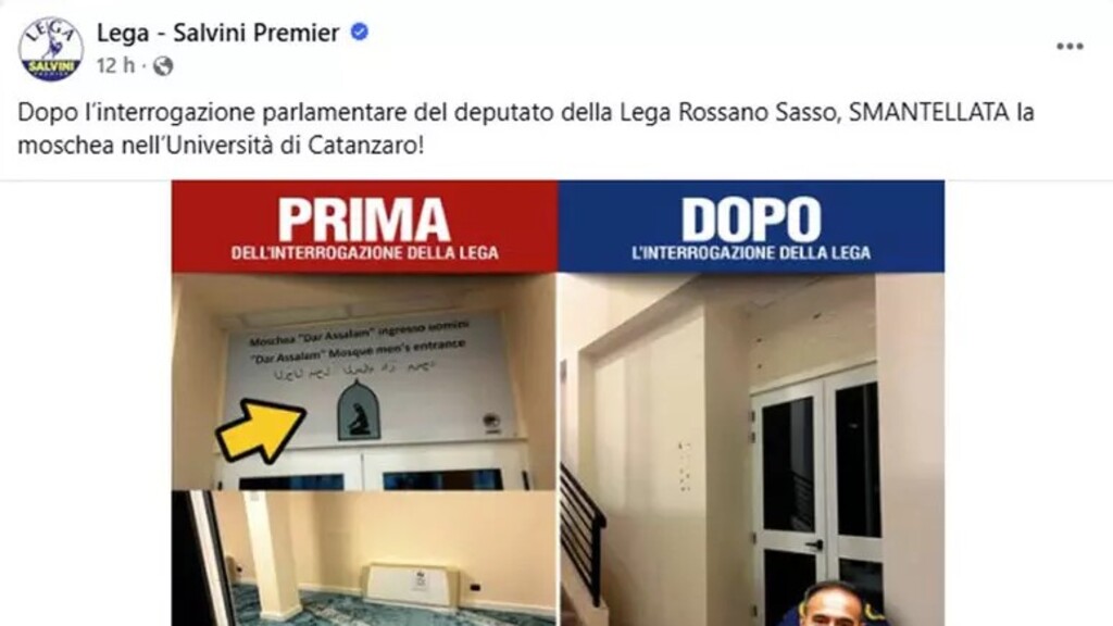"Dopo l'interrogazione parlamentare del deputato della Lega Rossano Sasso, smantellata la moschea nell'Università di Catanzaro!" è scritto nel post corredato da due immagini dell'ingresso dei locali, prima, con la targa che indicava il luogo di culto, e poi, la stessa entrata senza alcuna indicazione.
