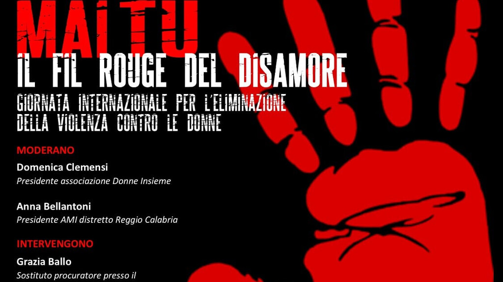 L'Associazione Avvocati Matrimonialisti Italiani, distretto di Reggio Calabria, in collaborazione all’Associazione “Donne Insieme”, presenta l’evento “Mai tu–Il fil rouge del disamore” il 25 novembre 2025, ore 19 al Cartoline Club di Reggio Calabria, Via Friuli, Dir. II, n. 18, in occasione della Giornata Internazionale per l’Eliminazione della Violenza contro le Donne.