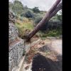 Il tronco appare sollevato dal terreno e la base è ormai quasi del tutto staccata dal suolo. L'intreccio dei rami delle piante circostanti funziona come un sostegno provvisorio, impedendo per ora la caduta sulla strada ma rendendo evidente la pericolosità della situazione.