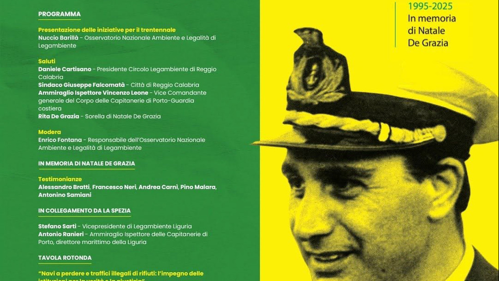 Legambiente, insieme al Comune di Reggio Calabria, dedica due giornate di testimonianza, dialogo e memoria al Capitano Natale De Grazia, figura simbolo di coraggio, legalità, servizio al Paese, tutela dell’ambiente e amore per il mare.