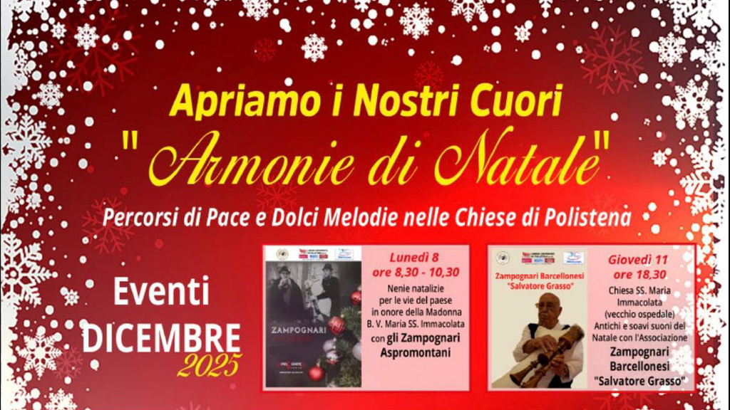 Il programma di "Armonie di Natale" - Percorsi di pace e dolci melodie nelle chiese di Polistena, frutto di un impegno civico e culturale che merita di essere sottolineato, porta la firma del direttore artistico Pietro Paolo Cullari e vede la partecipazione di numerosi artisti calabresi pronti a condividere il loro talento in un clima di festa, solidarietà e vicinanza. Ogni appuntamento (inizia tutto oggi con gli Zampognari Aspromontani sino al 30 Dicembre alla Chiesa della SS. Trinità con "Natali calabrisi" - Canti della tradizione natalizia con Salvatore Briganti) è pensato come un abbraccio alla comunità, un modo per rafforzare quei legami che rendono il Natale una ricorrenza tanto attesa quanto sentita.