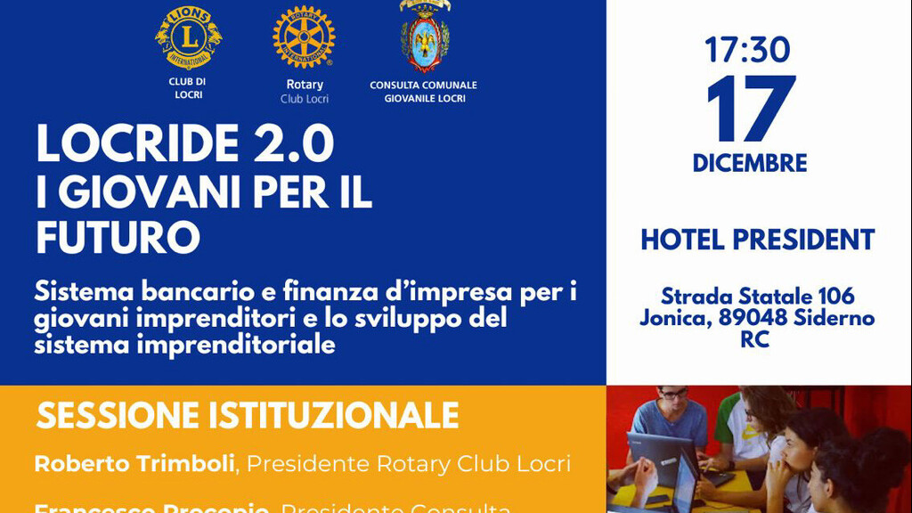 Giovani e sviluppo imprenditoriale, questo il focus del convegno “Locride 2.0 - I giovani per il futuro”, che si terrà mercoledì 17 dicembre, alle ore 17.30, nelle sale dell’Hotel President, a Siderno; evento promosso e organizzato da Lions Club Locri e Rotary Club Locri, in collaborazione con la Consulta Comunale Giovanile di Locri e con la partecipazione delle Consulte giovanili di Sant’Ilario dello Ionio, Marina di Gioiosa, Gerace e Caulonia.