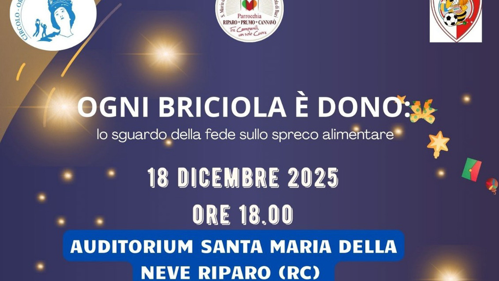 Giovedì 18 dicembre, alle ore 18:00, presso l’Auditorium Santa Maria della Neve di Riparo (Reggio Calabria), si terrà l’incontro pubblico dal titolo “Ogni briciola è dono. Lo sguardo della fede sullo spreco alimentare”, un appuntamento di riflessione, formazione e condivisione rivolto all’intera comunità, in particolare in prossimità del tempo natalizio.