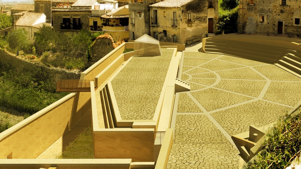 Dal punto di vista architettonico, il progetto interessa uno slargo a emiciclo delimitato da una cavea di cinque gradoni, collocata al centro del Borgo e aperta verso il mare. L’ampliamento dello spazio consente di esaltare la morfologia del territorio e la stretta spazialità delle vie storiche, creando un terrazzo-belvedere utilizzabile come palco per le attrezzature sceniche. Alla quota inferiore, invece, è previsto un articolato sistema di spazi pubblici di servizio, a supporto delle attività sceniche o fruibili per eventi indipendenti.