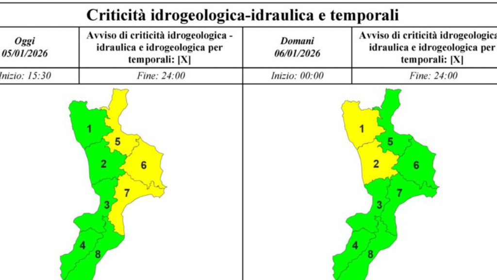 La Protezione Civile della Calabria ha emesso per oggi, 6 gennaio 2026, un avviso di criticità idrogeologica e idraulica legato a possibili temporali. In particolare, è stato diramato un livello di allerta giallo per le zone 1 e 2 della regione, corrispondenti principalmente all’alto Tirreno cosentino, mentre nelle altre aree il livello di rischio resta verde.
