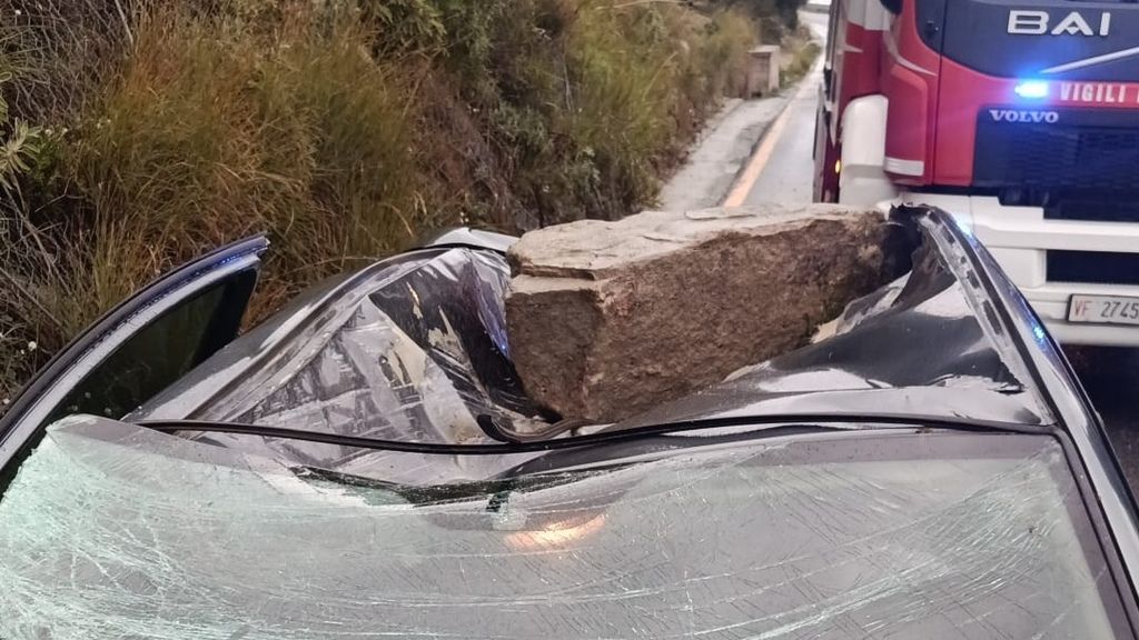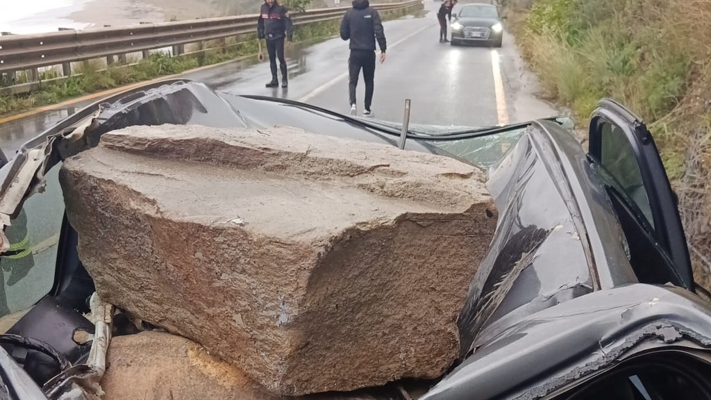 Ad Africo, a causa del forte maltempo che ha interessato la zona, un masso si è staccato dalla scogliera ed è finito su un’automobile in transito lungo la SS106.