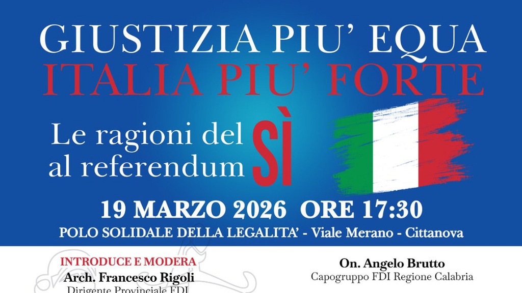 Si terrà domani, alle ore 17:30, a Cittanova, presso il Polo Solidale della Legalità in viale Merano, l’incontro pubblico dal titolo “Giustizia più equa, Italia più forte – Le ragioni del Sì al referendum”.