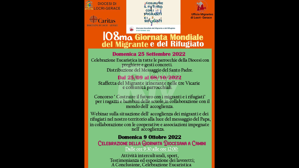 “Costruire il futuro con i migranti e i rifugiati” è il tema indicato dal Santo Padre, papa Francesco, per la 108ª Giornata mondiale del migrante e del rifugiato che la Chiesa cattolica celebrerà domani.