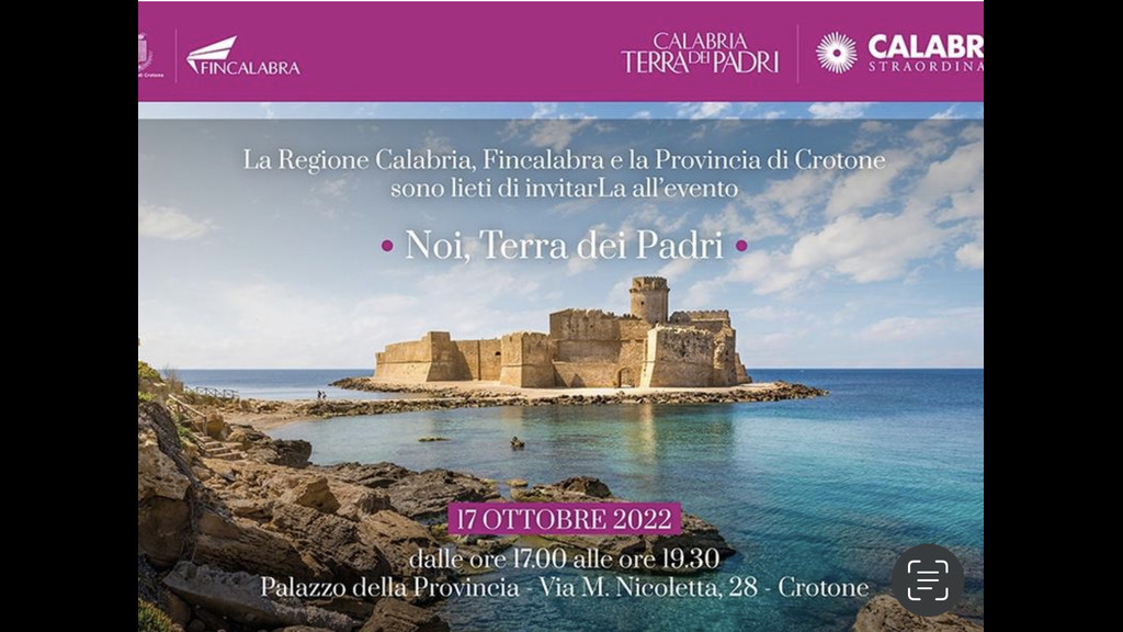 Prende il via lunedì 17 ottobre da Crotone il tour di eventi di animazione territoriale pensato per raccontare ai Comuni della provincia e ai cittadini le opportunità che offre il progetto Calabria Terra dei Padri, l’iniziativa promossa da Regione Calabria e gestita da Fincalabra volta a incrementare il flusso turistico regionale attraverso un “turismo delle radici” o “di ritorno”.