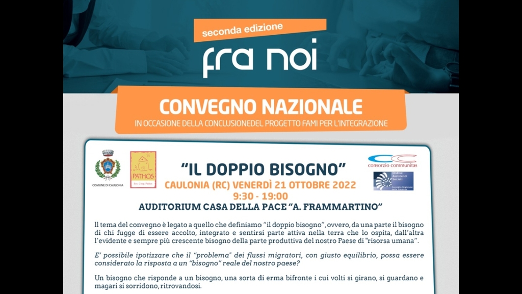 Venerdì 21 ottobre, all’Auditorium Casa della Pace “A. Frammartino” di Caulonia Marina (RC), dalle ore 9.30 alle 19.00, avrà luogo il Convegno nazionale “Il doppio bisogno”, organizzato dalla Cooperativa Sociale Pathos a conclusione del progetto FAMI “Fra noi” 2.