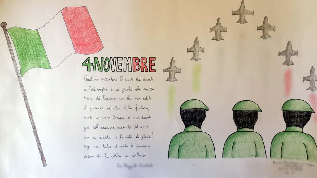 Il 4 novembre, infatti, l'Italia ricorda l'Armistizio di Villa Giusti - entrato in vigore il 4 novembre 1918 - che consentì di portare a compimento il processo di unificazione nazionale iniziato in epoca risorgimentale, annettendo i territori di Trento e Trieste. Per onorare i sacrifici dei soldati caduti a difesa della Patria il 4 novembre 1921 ebbe luogo la tumulazione del "Milite Ignoto", nel Sacello dell'Altare della Patria a Roma. Con il Regio decreto n.1354 del 23 ottobre 1922, il 4 Novembre fu dichiarato Festa nazionale. In questa giornata si intende ricordare, in special modo, tutti coloro che, anche giovanissimi, hanno sacrificato il bene supremo della vita per un ideale di Patria e di attaccamento al dovere: valori immutati nel tempo, per i militari di allora e quelli di oggi.