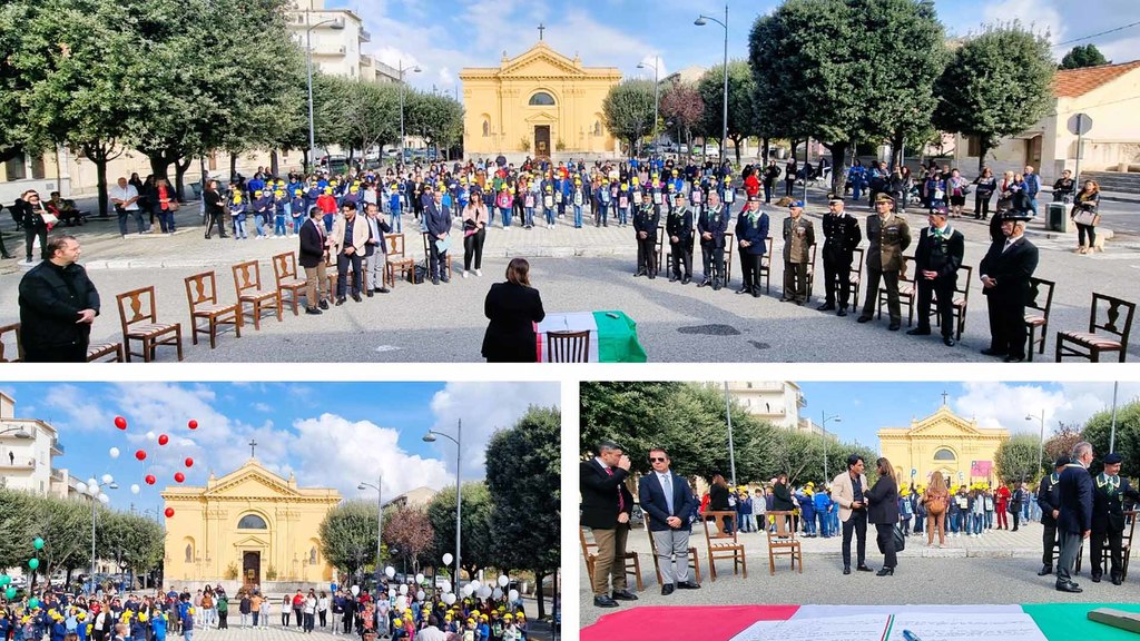 Gli alunni e le alunne della scuola secondaria V. Asprea, hanno poi ricordato per nome tutti i caduti, per i quali hanno piantato degli alberi, in Piazza Municipio. Un volo di palloncini tricolore e la peace art, degli allievi e delle allieve della scuola primaria, hanno suggellato l’importanza del momento.