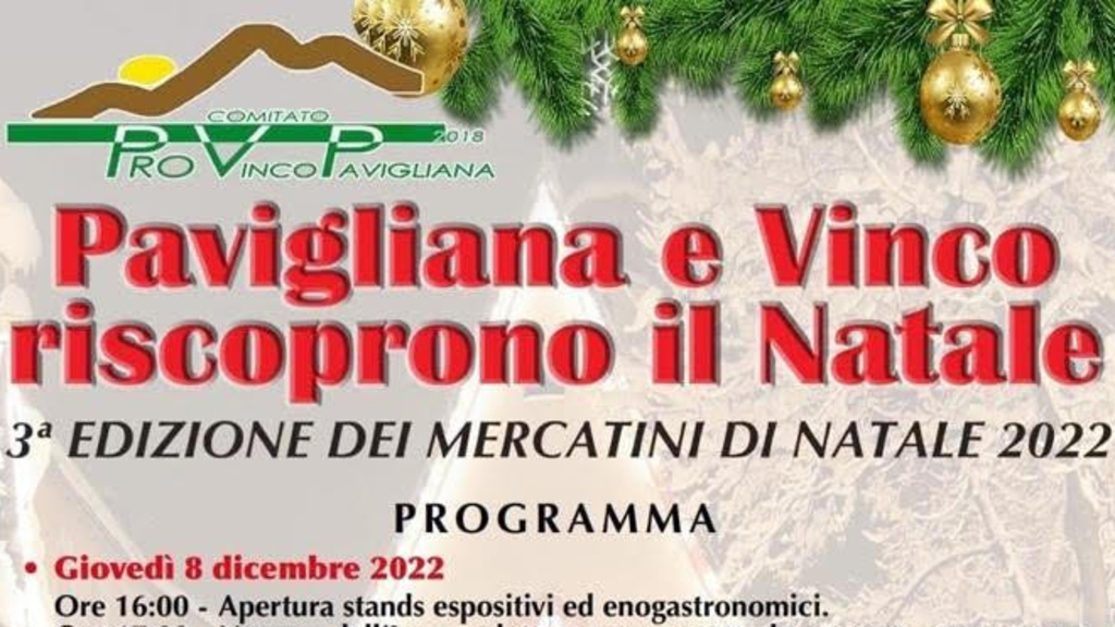 Il Comitato Pro Vinco e Pavigliana, per i giorni 8 – 9 – 10 - 11 dicembre 2022, ha organizzato la 3° edizione dei Mercatini di Natale. Un suggestivo villaggio natalizio per promuovere le attività artigianali e commerciali del territorio oltre che per socializzare ed aggregare. L'obiettivo è quello di realizzare un’attrazione concreta per dare impulso al commercio e al turismo locale, richiamando l’attenzione dei cittadini verso la periferia, valorizzando lo shopping natalizio all’insegna della qualità, in un’atmosfera di festa ed armonia. A darne notizia, un comunicato del Comitato organizzatore.