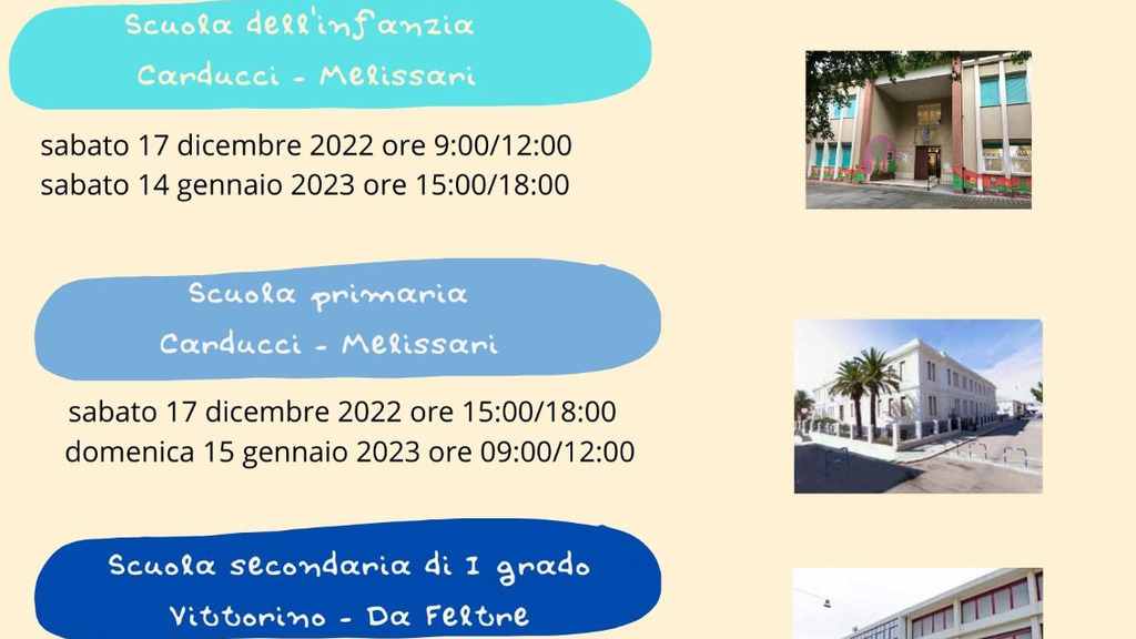 La prima giornata dell’Open day si svolgerà sabato 17 dicembre, dalle ore 9:00 alle 12:00 per la scuola dell’Infanzia e dalle ore 15:00 alle 18:00 per la scuola Primaria. Saranno aperti al pubblico i due plessi, Carducci e Melissari. Domenica 18 dicembre, dalle ore 9:00 alle 12:00, sarà possibile visitare la scuola secondaria di primo grado Vittorino da Feltre.