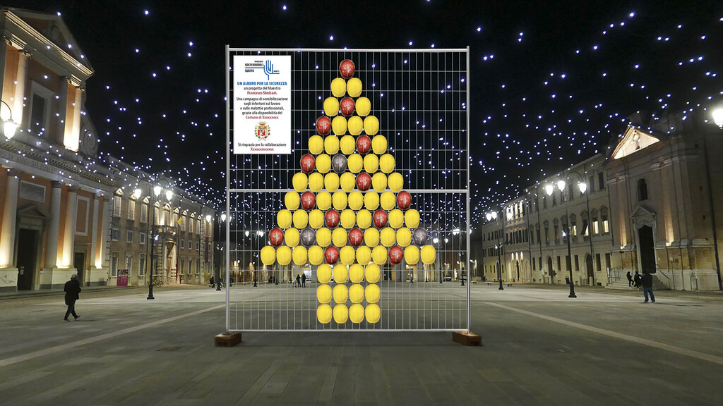 L’opera di Sbolzani è composta da una figura di albero di Natale che prende forma da caschi antinfortunistici montati su una tipica intelaiatura da cantiere, ma ogni albero sarà allestito preservando una propria originalità e diventando un’opera unica e autentica che mira però ad accomunare l’obiettivo di contrastare il lavoro senza sicurezza.