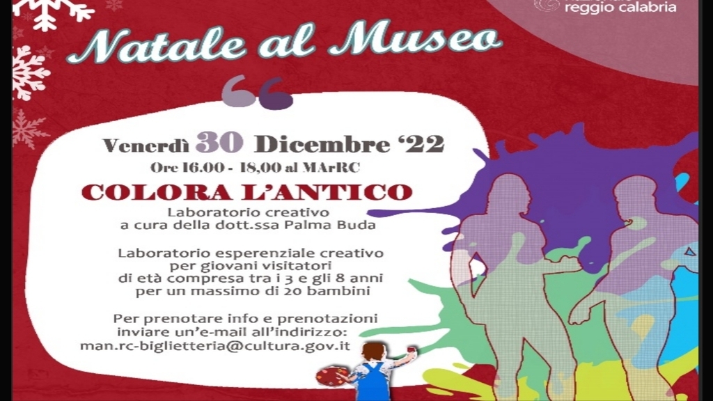 Il fortunato laboratorio didattico curato alla dottoressa Palma Buda è previsto dalle ore 16:00 alle ore 18:00: i piccoli disegnatori, dopo aver ridato vita e colore alle opere esposte al Museo, saranno guidati alla scoperta delle opere più importanti presenti nelle sale espositive. L’iniziativa è su prenotazione, per un massimo di 20 partecipanti accompagnati da un adulto, previo invio di una mail all’indirizzo: man.rc-biglietteria@cultura.gov.it