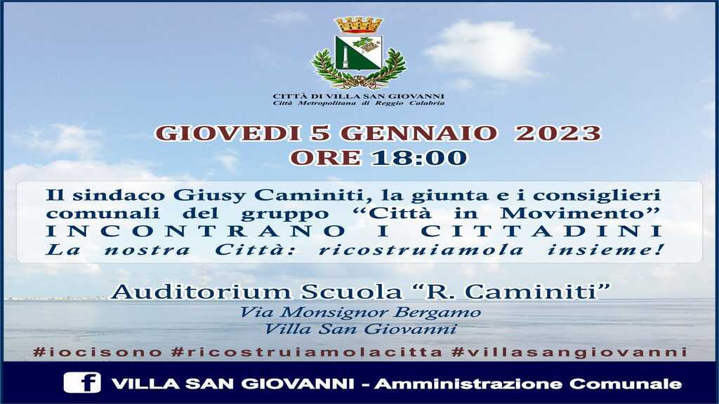 Giovedì 5 gennaio alle ore 18, presso l'auditorium della scuola "R. Caminiti" di Villa San Giovanni, il sindaco Giusy Caminiti, la giunta e i consiglieri comunali del gruppo "Città in movimento" incontrano la cittadinanza.