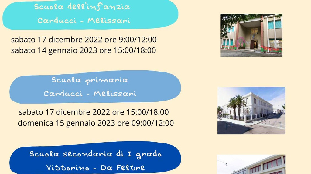 Oltre al Vittorino da Feltre, saranno aperti al pubblico i due plessi, Carducci e Melissari, che ospitano scuola primaria e scuola dell’infanzia.