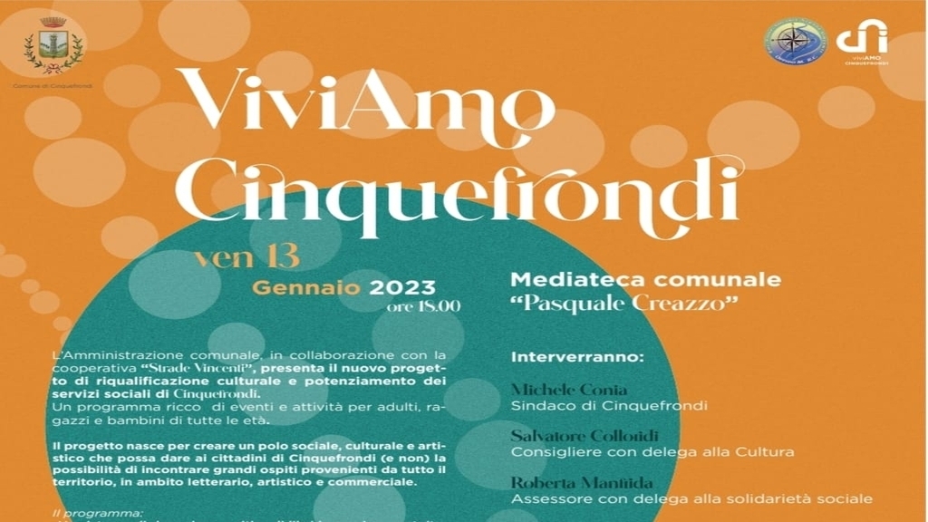Venerdì 13 Gennaio presso la sede della Mediateca Comunale di Cinquefrondi, verrà presentato e illustrato il progetto “ViviAmo Cinquefrondi”. Un’idea di sviluppo, valorizzazione e implementazione di eventi culturali, integrativi e sociali, con tutta la Comunità. Saranno mostrate le iniziative che andranno a coprire l’intera durata del lavoro tramite slide, dichiarazioni dei promotori e protagonisti dello stesso. Interverranno altresì Michele Conia Sindaco di Cinquefrondi, Assessori e Consiglieri coinvolti, Tina Frisina, Rappresentante della Cooperativa “Strade Vincenti”, nonché aggiudicatrice dell’appalto, Michela Franco e Vincenzo Furfaro, coordinatori del Progetto.