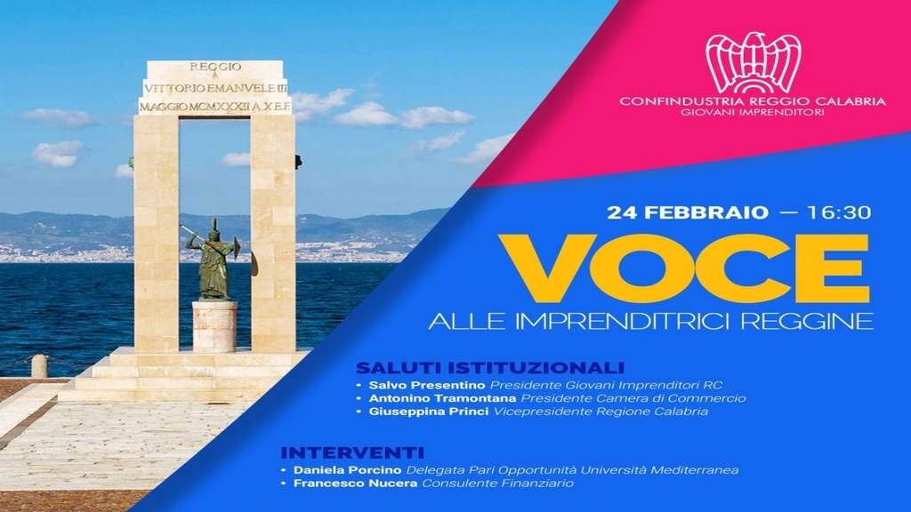Si svolgerà presso la sede reggina di Confindustria, venerdì 24 febbraio alle 16.30, l’incontro dal titolo “V.O.C.E…alle imprenditrice reggine”, organizzato dal Gruppo Giovani di Confindustria Reggio Calabria. L’incontro, nasce con l’intento di aprire un dialogo costruttivo e per far emergere, punti di forza e criticità, legati al mondo dell’imprenditoria femminile locale, creando un "luogo" di confronto, condivisione, supporto attivo, formazione, crescita e sostegno per le imprenditrici del territorio. Il gruppo Giovani Imprenditori di Confindustria Reggio Calabria promuove intende, infatti, costituire, un HUB, che coordinerà il percorso dedicato alla valorizzazione dell’imprenditoria femminile nel territorio. Referenti HUB V.O.C.E., Valore - Opportunità - Creatività - Empowerment, sono Valentina Mallamaci, Emy Presentino e Carmela Guerrisi, che hanno organizzato l'evento, con il supporto del Presidente del Gruppo Giovani, Salvo Presentino.