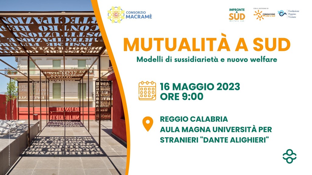 Martedì 16 maggio, dalle 09:00 alle 13:00, presso l’Aula Magna dell’Università per Stranieri “Dante Alighieri”, si svolgerà l’evento “Mutualità a Sud – Modelli di sussidiarietà e nuovo welfare”, promosso dal Consorzio Macramè. L’appuntamento si svolgerà alla presenza del Presidente – Paolo Morerio – e del Direttore – Carmine Guanci – della Fondazione Peppino Vismara e con le conclusioni affidate alla vicepresidente nazionale di Legacoopsociali, Marta Battioni.