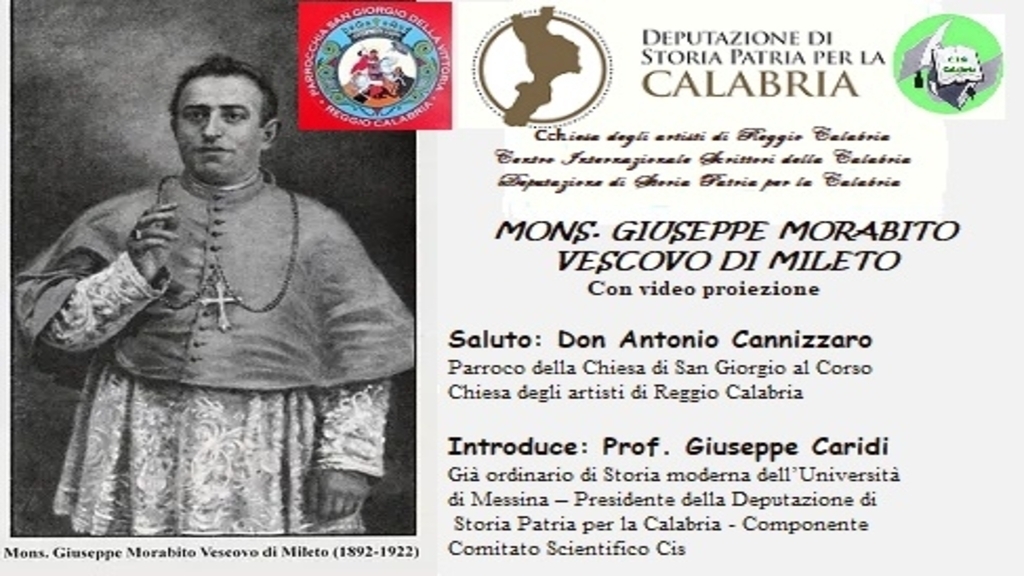 Il Centro Internazionale Scrittori, e la chiesa degli artisti di Reggio Calabria, con il patrocinio della Deputazione di Storia Patria per la Calabria, mercoledì 17 maggio 2023, alle ore 17:30, presso la sala San Giorgio della stessa chiesa rendono omaggio a Mons. Giuseppe Morabito, vescovo di Mileto. Aprono l’incontro gli interventi di don Antonio Cannizzaro, sacerdote della chiesa di San Giorgio al Corso e di Loreley Rosita Borruto, presidente del Cis della Calabria. Introduce la conversazione il prof. Giuseppe Caridi, già ordinario di Storia moderna dell’università di Messina, presidente della Deputazione di Storia Patria per la Calabria. Relatore dell’incontro è il prof. Alfredo Focà, ordinario di Microbiologia e Microbiologia clinica presso il Policlinico Universitario ”Mater Domini” di Catanzaro. Segue l’intervento programmato di mons. Antonino Denisi, storico della chiesa reggina, decano del Capitolo Metropolitano. Mons. Giuseppe Morabito, (5 giugno 1858 – 3 dicembre 1923), da giovanissimo ha frequentato il Seminario Arcivescovile di Reggio Calabria e nel 1881, dopo essere stato ordinato sacerdote, parte alla volta di Roma per completare la sua formazione all’Università Gregoriana. Viene nominato vescovo di Mileto il 15 dicembre del 1889, ma dopo pochi anni, nel 1992, per gravi motivi di salute, deve rinunciare all’incarico. Vive gli ultimi anni della sua vita in completa solitudine, fatta eccezione per le pochissime persone che lo assistono.