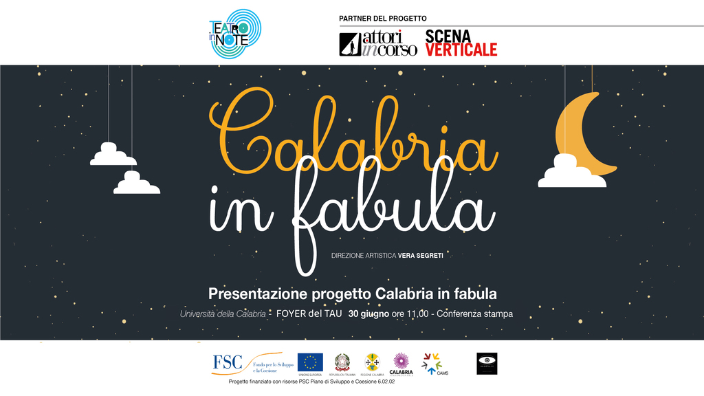 Venerdì 30 giugno alle ore 11.00 nel Foyer del TAU Unical verrà presentato Calabria in Fabula, il nuovo progetto firmato da Teatro in Note con la direzione artistica di Vera Segreti e quella organizzativa di Lucia Catalano e realizzato in partenariato con Scena Verticale e AttorInCorso, che dall’1 luglio al 2 agosto attraverserà le cinque province calabresi animando alcuni tra i borghi più affascinanti della regione. Un progetto co-finanziato dal PSC Piano di Sviluppo e Coesione 6.02.02 erogate ad esito dell’Avviso “Progetti Speciali per lo sviluppo dell’attività teatrale” della Regione Calabria - Dipartimento Istruzione Formazione e Pari Opportunità – Settore Cultura”.