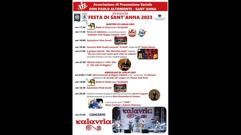 E quest’anno? L’associazione continua a stupire in un crescendo di qualità…Il 25 luglio lo spettacolo inizia con i Bimbi in Piazza ed i gonfiabili, il Torneo di Subbuteo, l’esposizione delle moto Ducati; continua con l’esibizione artistica dei ragazzi della Scuola di Musica G Verdi, poi il Teatro con una pièce comica in dialetto reggino. Conclude la serata la performance artistica di Alfredo Auspici ed i “Mal i Skin” con lo spettacolo “Dio salvi la Reggina”.
