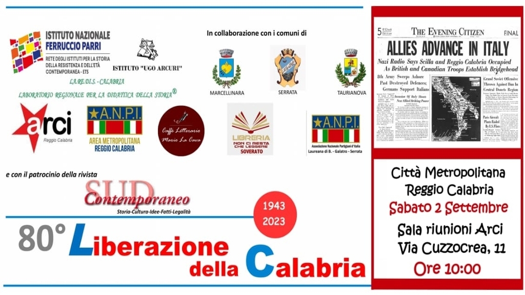 Si terrà, sabato 2 settembre, a Reggio Calabria, presso la sala riunioni Arci, in via Cuzzocrea 11, il convegno di studi “Geografia della memoria. La Liberazione della Calabria e le stragi naziste nel Mezzogiorno”, organizzato, nell’ambito di una serie di iniziative itineranti sul territorio regionale, dall’Istituto “Ugo Arcuri” per la Storia dell’Antifascismo e dell’Italia Contemporanea in Provincia di Reggio Calabria, in collaborazione con l’Arci di Reggio Calabria, l’Anpi dell’Area Metropolitana di Reggio Calabria, la sezione Anpi di Laureana di Borrello - Galatro - Serrata, il Caffè Letterario “Mario La Cava” di Bovalino, la Libreria “Non ci resta che leggere” di Soverato, e i Comuni di Marcellinara, Serrata e Taurianova.