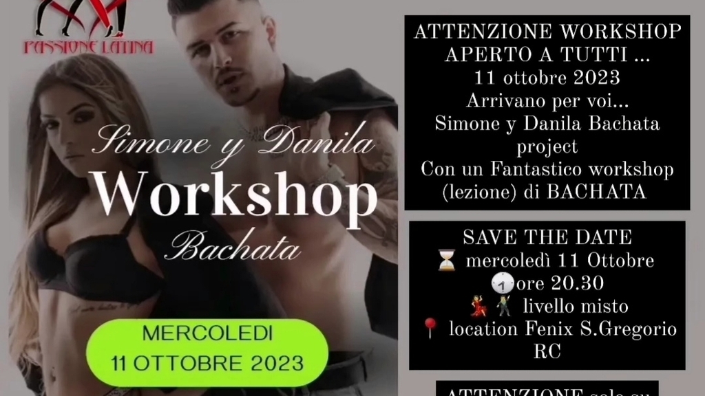 Passione Latina dei maestri Gianfranco Arcudi ed Agata Suraci, presenta alla città gli artisti internazionali di balli caraibici più in voga del momento Simone e Danila. Mercoledì 11 ottobre presso la più grande scuola di ballo della provincia di Reggio Calabria del maestro stellato Giuseppe Modafferi, si terrà un workshop di Bachata. Insieme per il raggiungimento di grandi risultati in vista anche della stagione invernale di Passione Latina.