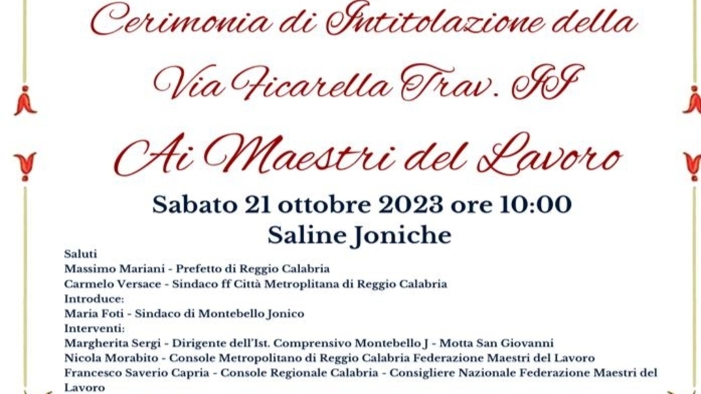 Alle ore 10 di sabato 21 ottobre si svolgerà una cerimonia alla quale parteciperanno il prefetto di Reggio Calabria Massimo Mariani, il sindaco di Montebello Ionico Maria Foti, il sindaco ff della Città Metropolitana di Reggio Calabria Carmelo Versace, il presidente nazionale della Federazione dei Maestri del Lavoro Elio Giovati, il vice presidente nazionale per il Sud e le Isole Roberto Bauco, il consigliere nazionale e console regionale della Calabria Francesco Saverio Capria il console Metropolitano di Reggio Calabria, Nicola Morabito, nonché autorità civili, militari e religiose e i consoli dei maestri del lavoro delle altre quattro province calabresi: Tommaso Lumare (KR), Fiore Laugelli (CZ) Renzo Perri (CS) e Rosario Paolì (VV).