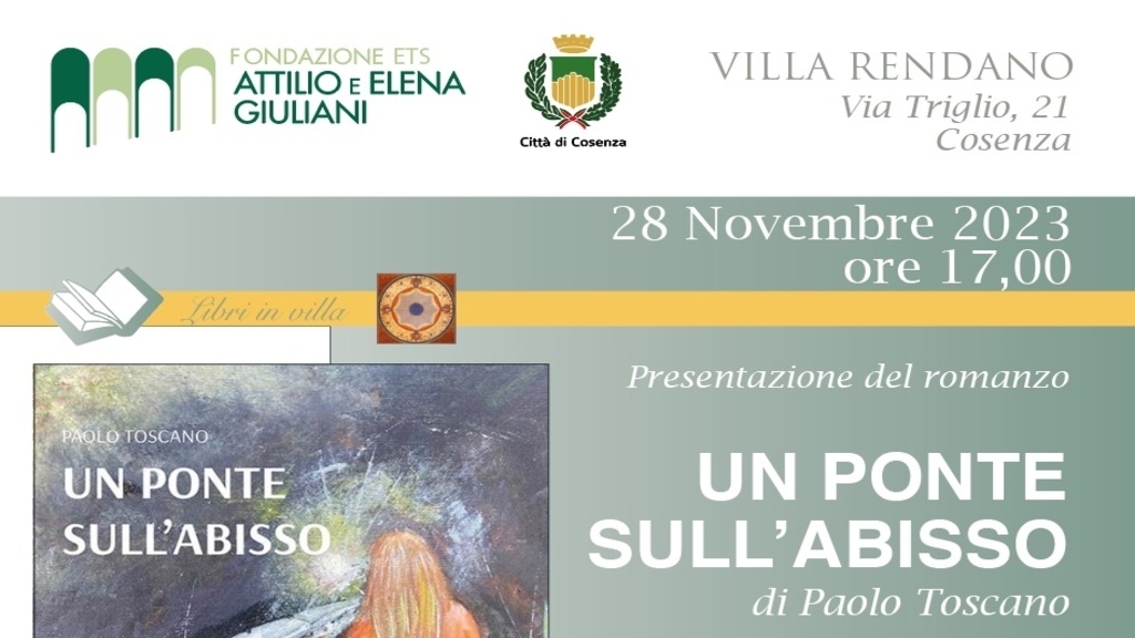 A Villa Rendano arriva anche Un ponte sull’abisso, pubblicato dal giornalista e scrittore Paolo Toscano per i tipi di Albatros. Il romanzo di Toscano, che sta riscuotendo significativi consensi, sarà al centro dell’incontro organizzato martedì prossimo, 28 novembre, alle 17, dalla Fondazione “Attilio e Elena Giuliani” in collaborazione con il Comune di Cosenza e con le quarantatré associazioni culturali che la scorsa primavera hanno sottoscritto il “Patto per la Cultura”.