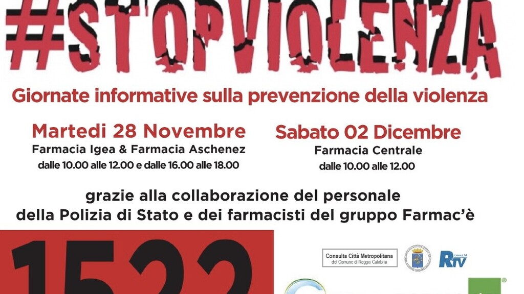 Ritornano infatti nelle farmacie “Farmac’è” le giornate informative sulla prevenzione della violenza, in special modo di quella domestica, con il personale della Polizia di Stato che sarà presente domani, martedì 28 novembre, dalle ore 10.00 alle ore 12.00 e dalle ore 16.00 alle ore 18.00, presso la Farmacia Igea, in Via Sbarre Inferiori 371, e la Farmacia Aschenez, in Via Aschenez 137.