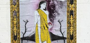 Opera di Street Art dell'artista LBS che denuncia il tormento della Conoscenza nel Mondo Moderno