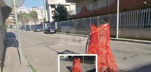 Transennata con rete arancione e pali in ferro, la voragine costringe automobilisti e pedoni a manovre rischiose