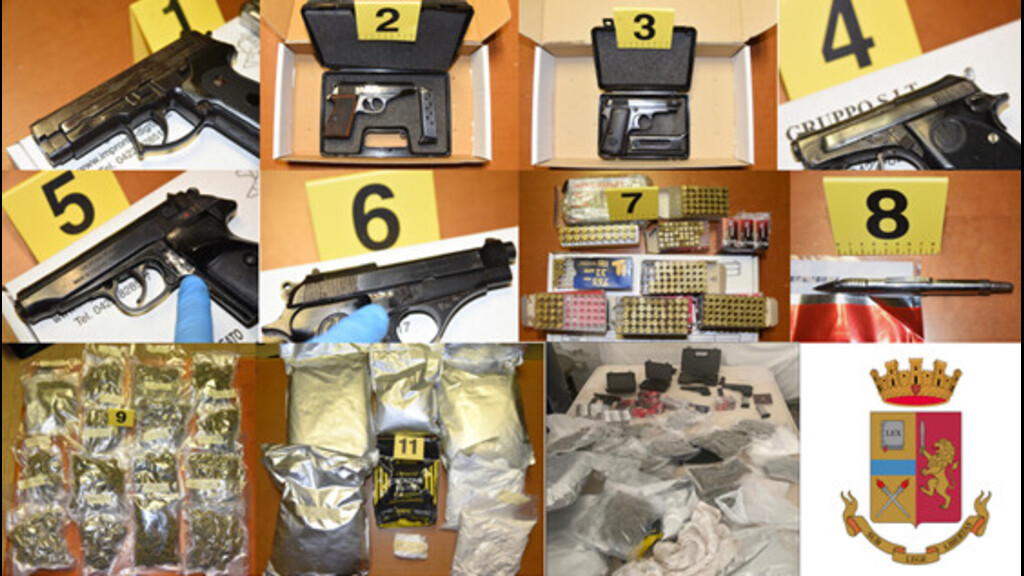 Nel frattempo il personale rimasto a presidio dell’immobile, di fatto disabitato da tempo ed adibito a deposito, rinveniva e sottoponeva a sequestro all’interno dello stesso 7 pistole, tutte clandestine perché prive di matricola, un grande quantitativo di munizioni, kg 1,489 - suddivisi in 15 buste - di marijuana; kg 1,378 - suddivisi in 3 buste - di hashish.