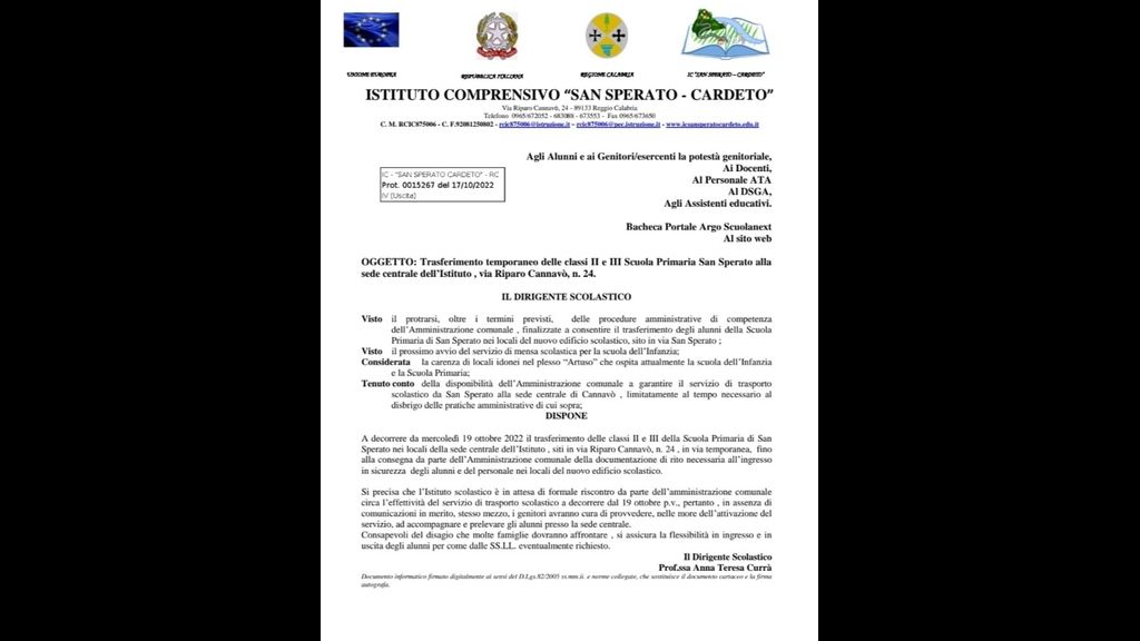 Il decreto del dirigente scolastico dell’istituto comprensivo “San Sperato Cardeto” «considerato il protrarsi delle procedure amministrative per consentire i trasferimento degli alunni della scuola primaria di San Sperato al nuovo edificio» – stabilisce che – a decorrere da 19 ottobre le classi II e III della primaria dovranno essere spostate nell’istituto di via Cannavò Riparo.