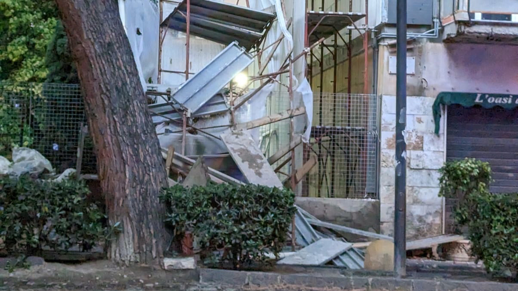 Una impalcatura crolla sul marciapiede sottostante a causa del forte vento che ha soffiato su Reggio Calabria per gran parte della giornata. È successo sul viale Calabria alla struttura messa in piedi all'interno di un cantiere probabilmente per lavori di ripristino della facciata di uno stabile. L'impalcatura caduta solo per una fortunata coincidenza non ha colpito alcune persone che passavano proprio in quegli istanti nelle vicinanze del cantiere e che, passata la paura, hanno poi postato sui social una immagine con la scritta "God save Reggio". Un altro dei danni causati dal maltempo in una giornata a dir poco infausta.